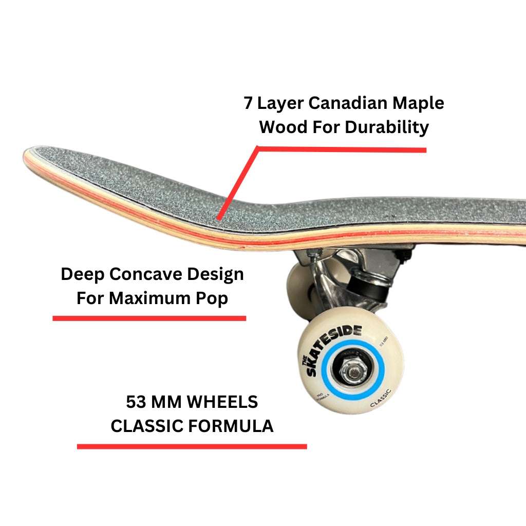 Designed for kids, built with pro-grade quality! SKATESIDE complete skateboards feature a durable 7-ply wood deck, sturdy metal trucks, classic SKATESIDE Formula wheels, smooth bearings, and reliable hardware. Perfect for young riders ready to take their skills to the next level, these boards combine professional-grade performance with kid-friendly design—making them the ultimate choice for their first skateboard!